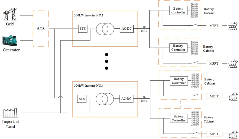 2.Når flere 500 kW systemer drives parallelt og distribuerer STSa på tværs af forskellige 500 kW invertere, er det afgørende at sikre, at kabellængden fra nettets forbindelsespunkt til belastningsforbindelsespunktet er ensartet;